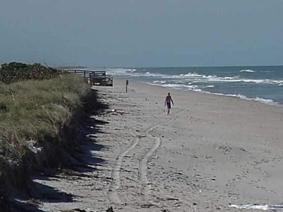 Around the corner you will pass the numbered parking areas. Each one provides access to the Atlantic Ocean and one of the most beautiful beaches on this coast. This is the last place you will see 24 continuous miles of undeveloped beach on the East Coast of Florida. The yellow flowers along the dune and roadside are beach sunflowers. They are one of the important plants that help to stabilize the dune area with their roots. |  |