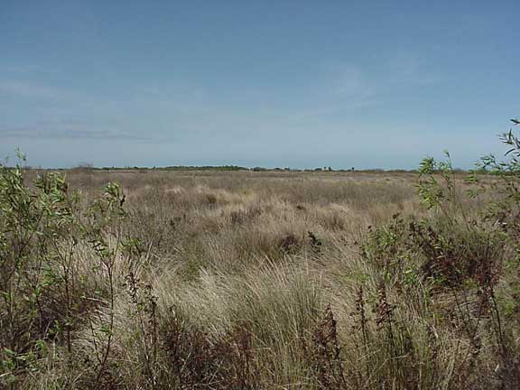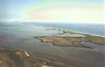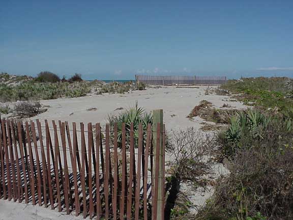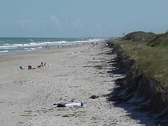 To the east is the ridge of the sand dune that protects the mainland from storms occurring at sea. Salt spray often fills the air while flocks of brown pelicans soar effortlessly in line about 20 feet above the dune. The photo shows a "blowout" of the dune caused by hurricane Irene in 1999.