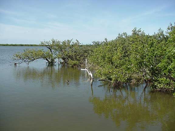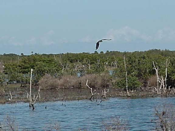 Directly in front of you to the north is a good example of the black mangrove. This plant is easily distinguished by its "breathing roots" projecting into the air from the mud. These roots help to aerate the plant when the water rises. Black mangroves also cope with their salty environment by their ability to excrete salt through the salt glands on the leaves. Take a close look at the leaves and maybe you can see the salt crystals. The black mangrove's fragrant flowers are a good source of nectar for the bees.