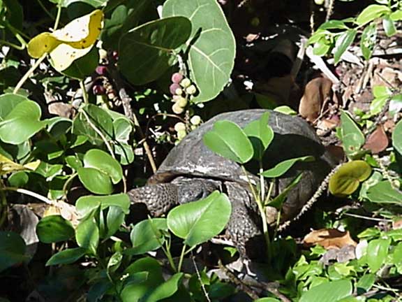 During the years of trying to rid this area of mosquitoes, some of the natural grasses were destroyed. Thick shrubs started to change the salinity of the salt marsh and this encouraged the growth of the cattails you see to the north. These aquatic perennials are found mainly in fresh water marshes. Cattails form dense stands and provide favorable habitat for red-winged blackbirds. The rootstock is mostly starch, edible and was ground into meal by Native Americans and early settlers. Young shoots can be eaten like asparagus. Higher up and behind the cattails are saw palmettos. These are shrubs with fan shaped leaves and sharp, saw-like teeth along the leaf stem. Their flowers are used in honey production. The black juicy fruit was eaten, used as flavoring during early times, and is today used in prostate cancer research. Thickets of these shrubs are good habitats for the gopher tortoise and eastern indigo snake. |  |