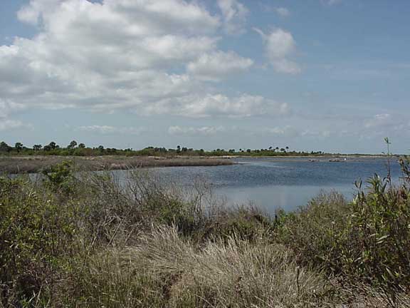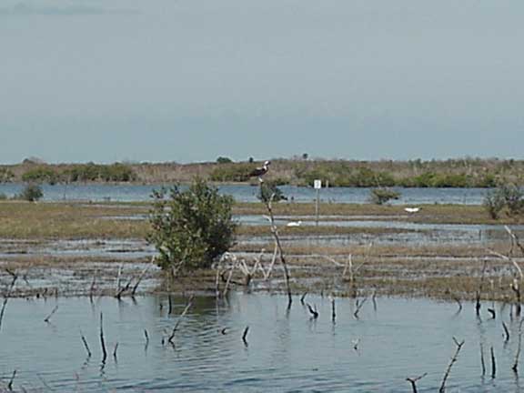 In the 1950's, the government tried to make this area more habitable to man by reducing the number of mosquitoes. If you step outside your car on a hot summer afternoon, you will realize they did not reach their goal. Visitations by mosquitoes in this marshy area are a way of life. The result of the attempted mosquito eradication was a series of impoundments, dikes and spoil islands which greatly altered the natural ecosystem. Some native wildlife ceased to exist, such as the dusky seaside sparrow, while others thrived. Islands such as the ones you see in front of you are home for many.