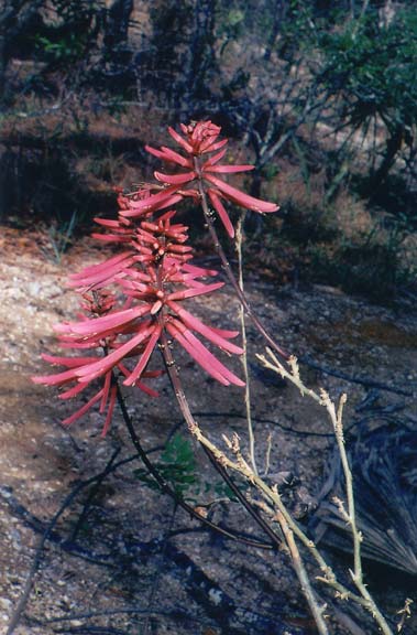 One of the first showy, blooms in the early spring. Bright red spike of flowers usually precedes the leaves. Stems are thorny. The name coralbean refers to the beautifully colored seeds which become apparent when the seed pods split open.