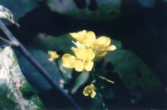 Tall annual with brightly colored flowers that have a typical mustard configuration. After blooming in January, the flowers are followed by elongated fusiform seed pods (siliques), which remain as multiple rocket-like stalked extensions on the upper part of the lifeless dried plants. Striking appearance while in bloom along the first part of the Forest road.