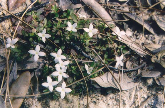 Low creeping plants. The Small flowers have four white petals, with yellow colored central areas. Abundant along south edge of burn area.