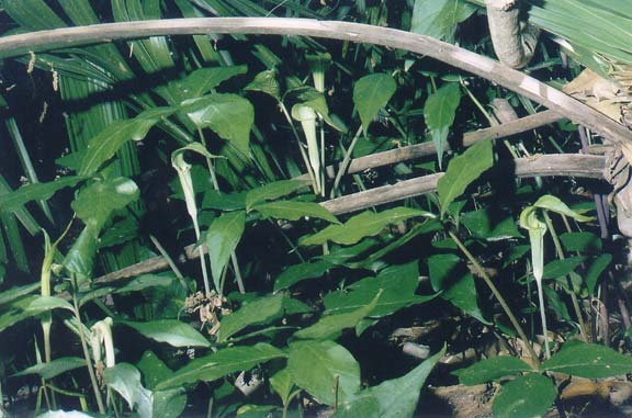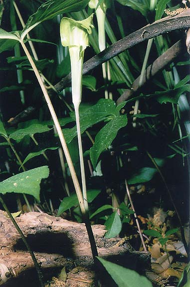 Found in early spring in the hydric (low wet) area. Without the flowers, the set of three shiny leaves resembles poison ivy. Like many closely related plants, its tissues contain sharp crystals of calcium oxalate (raphides), which, if ingested, produce a prolonged sensation of stinging and swelling of the mouth tissues.