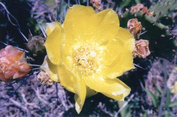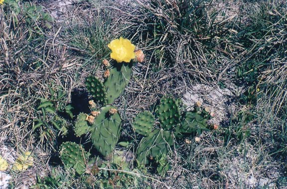 Spiny, oval flattened stems are tightly joined together at narrowed connection sites. The showy, flower is followed by an edible pulpy, reddish many seeded fruit. Found scattered throughout the Forest.
