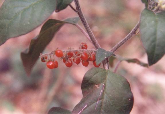 The name of the plant refers to the moderately indelible orange-red juice in the berries, which are preceded by inconspicuous white Flowers. Seen in disturbed areas along the trails.