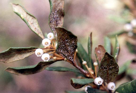 Very, fragrant bell shaped flowers in April and May. Note the strong characteristic downturning of the leaf margins and the rusty, appearance of the stems.