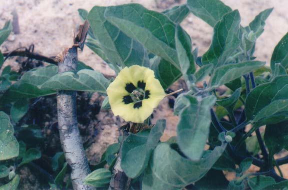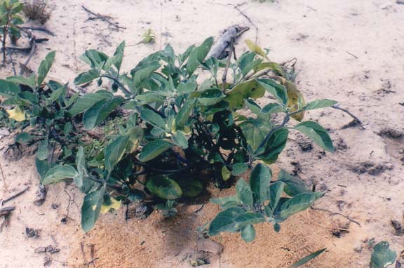 A small shrubby or low plant - small white flowers are reminescent of those seen on potato and tomato plants, since they are closely related.