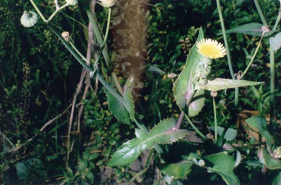 Upright plant with dandelion-like yellow flowers. Weakly spiny leaves. Found along the edge of the burn area, sporadically throughout the year.