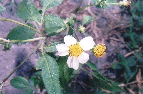 Common ubiquitous weedy plant. It is usual not to have a complete set of ray florets, giving the flowers an asymmetrical or incomplete took. Bidens refers to the two pointed teeth on the seeds, which cause them to stick to clothing as "booby lice". Alba refers to the white floral petals. Found throughout the year along the Forest road, and in many disturbed areas.