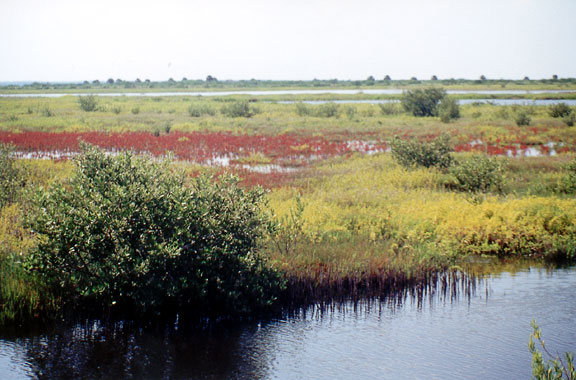 In 1969, the refuge began removing the dikes on this marsh, and the natural salt marsh is slowly restoring itself. In time, most of the shrubs you see will disappear, and the marsh will be as it once was: an open grassland between the river and land.