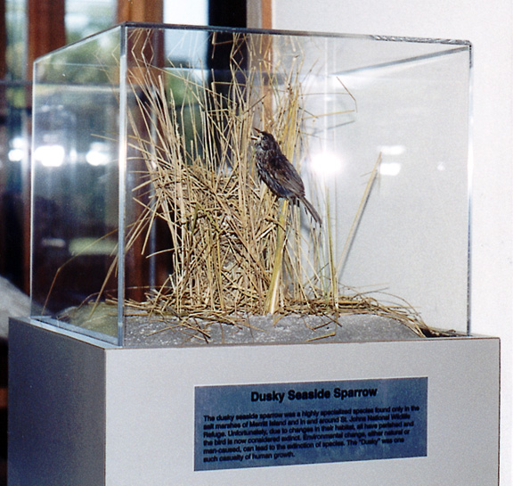 The natural salt marshes of Merritt Island and the St. Johns River west of Titusville, once were home to a non-migratory songbird known as the dusky seaside sparrow. The dusky was not discovered until 1872, and this was the only place in the world they have ever been observed. The dusky seaside sparrow was declared extinct in December, 1990.
