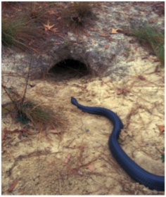 Without a doubt, the burrow is the most important feature of gopher tortoise biology. In east-central Florida, burrows average 4.5 m (15 ft.) long and 2 m (6 ft.) deep. The tortoise digs the burrow at about a 30° angle from the surface. Having a burrow provides many advantages for the tortoise, such as protection from predators, fire, and the weather. The burrow has a fairly constant environment that is not too hot, too cold, too humid, or too dry. This is very important for a cold-blooded animal that is at the mercy of the elements. The open sandy area in front of the burrow, called the apron, is often used by the female tortoises for a nest site.