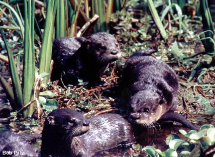 The river otters in Florida can be seen in both fresh and salt water ponds and lagoons. Their playful antics indicates that fishing may be secondary to play. Otters are more visible inthe late winter and early spring, as they search for crustaceans in the water. The otters in this photograph were resting in the warm sunshine. |