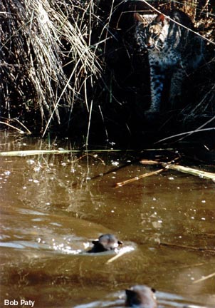 The bobcat is primarily a nocturnal hunter, but can be seen along deserted roads early in the morning or late in the evening hunting for small rodents. Its curiosity sometimes allows it to be photographed. This one was watching two river otters at play in a pond. |
