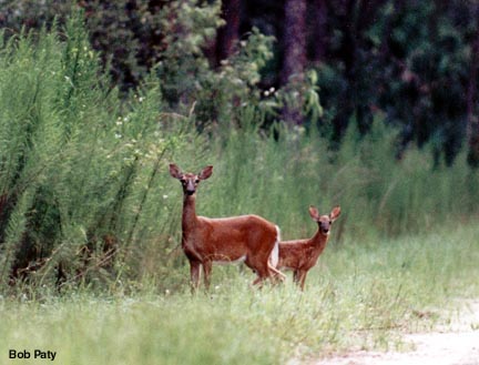 A whitetail deer and her fawn stop their activity to watch the photographer. A second later they raised their white tails and bounded away. |