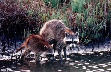 The raccoons around salt water marshes and lagoons in the coastal areas of Florida look much different than their upland cousins that live in woodland areas. Their fur is bleached from exposure to the sun and they look unkempt from prolong periods of remaining wet. These two were beside a canal where the mother was teaching her ofspring how to forage for food. |