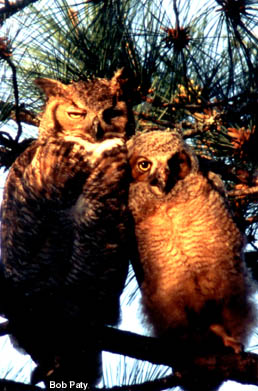 Cuddling to its mother, this great horned owl youngster will soon join the parents in flight. |