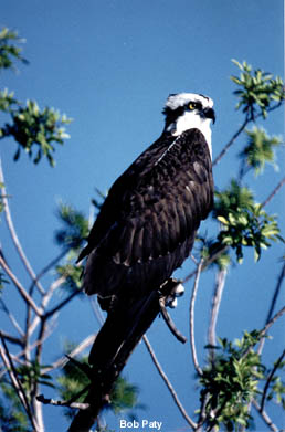 The osprey, sometines called fish hawk, has regained its population in florida. DDT at one time placed the existence of this beautiful bird in jeapardy. Nests are again commonplace, in fact ospreys ferequently choose ball field light clusters for their nest sites. The ability of the osprey to hover above the water, then dive for a fish, is matched by no other bird. |