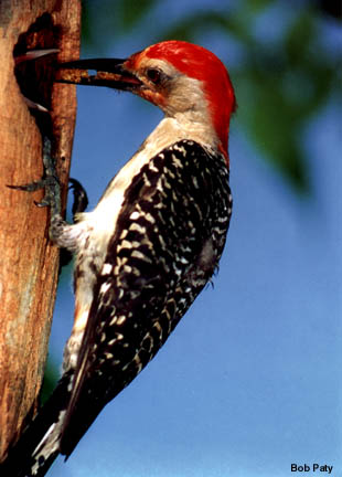 This woodpecker, oddly enough is called a red bellied woodpecker. This male has returned to the nest in a dead tree to feed a hungry chick. |