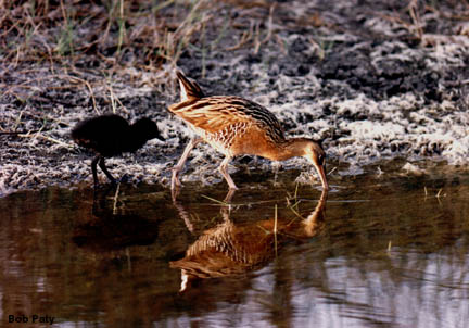 A clapper rail chick follows its parent as they feed along a shore line. These infant birds must learn to feed themselves almost as soon as they emerge from the shell. |