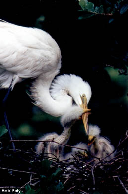 These great egret chicks must grapple with the parent egret's bill to get the adults to disgorge food for their dinner. |