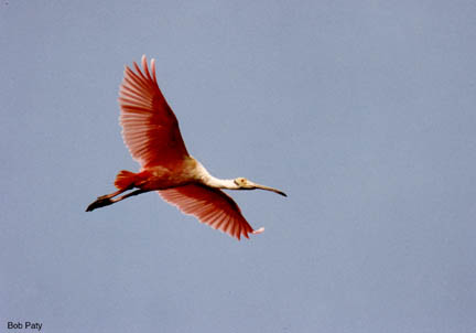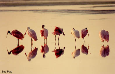 Roseate spoonbills, named for their paddle shaped bill, feed in shallow water by swinging their bill back and forth, scooping up small fish and crustaceans. |