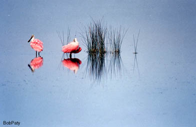 The reflection of the blue sky on the water gives the illusion that these two wading roseate spoonbills are suspended in mid-air. They were photographed in the Merritt Island National Wildlife Refuge. |