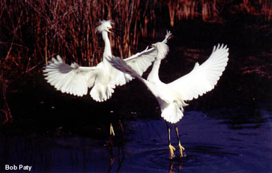 These snowy egrets are in a territorial dispute. Such sham battles occur frequently at the start of the breeding season. |