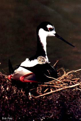 A baby black-necked stilt peers from beneath its mother's wing, where it has retreated form the hot sun. |