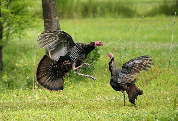 Exactly what prompted these two gobblers to put on this display, who knows? It wasn't a "sham" battle! It lasted about a minute, then the two settled down to preen. |