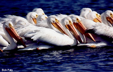 Unlike the brown pelican that plunges from flight into the water for fish, the white pelican remains on the water repeatedly dipping up small fish with itw bill. This group of white pelicans was photographed on the Merritt Island National Wildlife Refuge. |